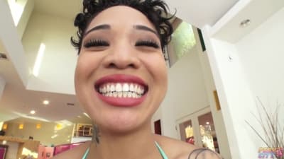 Honey Gold slobbers all over a big white cock, taking it deep in her throat, and receives a big load over her face before playing with the cum
