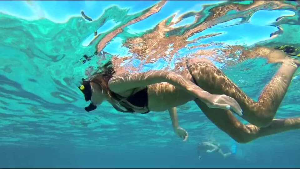 Pretty young brunette has a great time as she touches her bare skin as she is topless on holiday and feeling horny