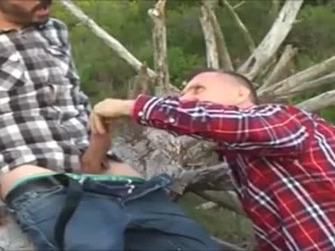 These two guys are wearing their check shirts while they're in the middle of nowhere sucking each other off