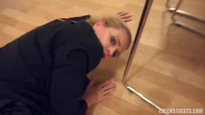 The blonde doesn't forget to keep her black pantyhose on so that this guy gets even more aroused while he's fucking her on the living room floor.