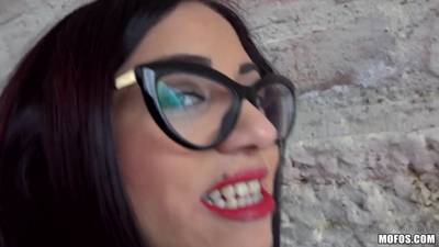 A brunette woman with sexy glasses and pretty red lips will get some money if she sucks his dick outside.