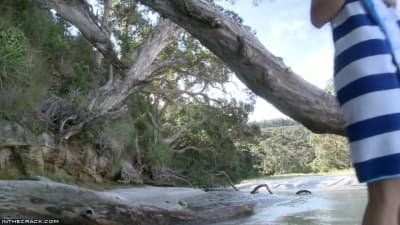 Sexy woman who is swimming at the beach during her vacations, gets really horny and has no time to go home to finger herself so she will do it right there!