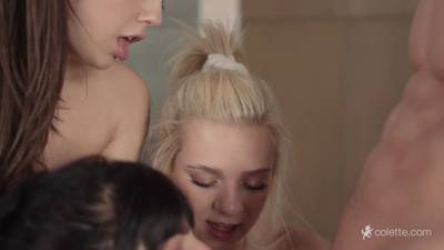 Three girls touch each other and lick each other's pussies in a beautiful way and get a very lucky guy involved!