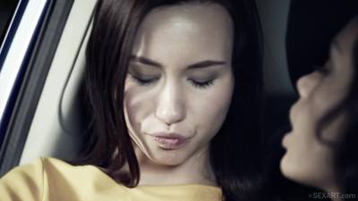 The two naughty girls, Sophie Lynx and Taylor Sands, both alone in the car, take the opportunity to lick each other's pussies.
