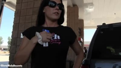 A pretty brunette kneels in front of a wall, in which there is a hole and from it sticks a cock. She sucks it intensely, like a pro!