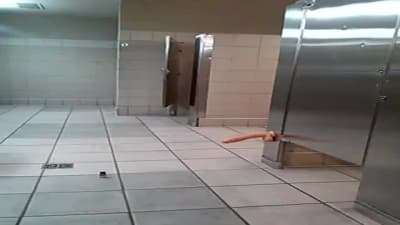 This chubby guy is in a public bathroom using his dildo to get himself off before he gets caught, don't miss this