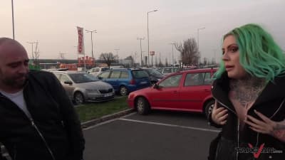 This green-haired beauty has the best time as she fucks with her man in the back of this van and gets all of his spunk