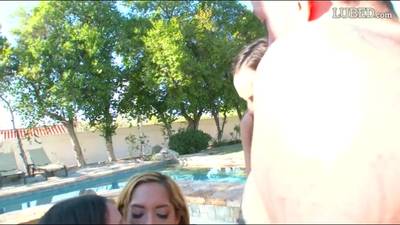 Dillion Harper, Chloe Amour and Lucy Doll, have a great time at the pool, sucking a fat cock and getting fucked in an orgy.