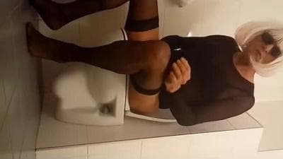 This blonde chick with a dick will masturbate in the public bathroom and record it with the mobile camera.