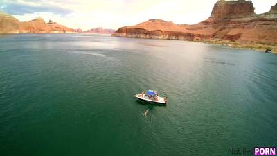Nasty college girls having a wonderful spring break where they fuck in the lake outside on a stone then inside the boat