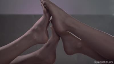 These two slutty lesbians wearing sex stockings attached to a dildo to give her the feeling of a dick