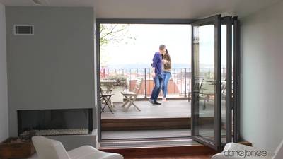 After kissing in the balcony she start getting horny going inside and takes her partner's pants off then enjoy sucking his hard dick