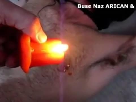 A masked man is being dominated. A guy is dripping hot candle wax on him and the guy makes him suck his dick.