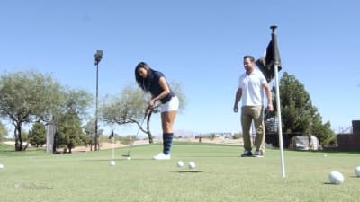 The charming golf instructor, will teach sexy brunette Audrey Bitoni how to send the ball into the hole and one can say, she is very skilled!