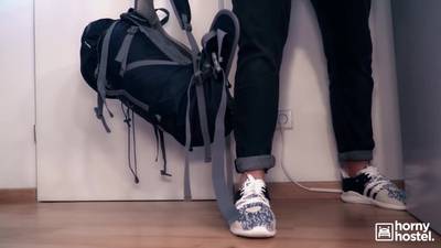 Young guy having a shared room with a sexy girl and another guy getting horny on the night and start fucking in threesome
