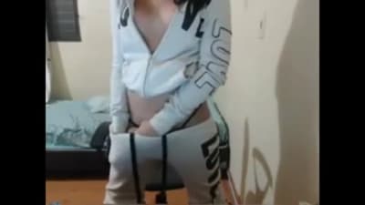 A horny transsexual in a training suit strips
