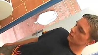 Two guys found a little bit of private space on a toilet where they suck each other off and do some anal pounding.