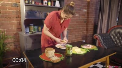 She was in a challenge to make a sandwich as fast as possible and after finishing she took her clothes off and start masturbating