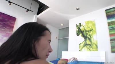 She's a hot brunette got her big booty oiled up and rimmed so good then enjoyed ridding that big cock until he cum on her