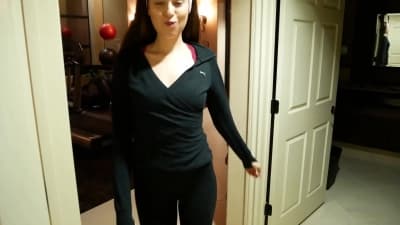 A brunette interrupts her gym workout to suck off a guy in the bathroom, gives him a deep throat and finishes with cum in her mouth.