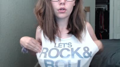 This nerdy brunette enjoys playing with her tits in front of the camera as she gets horny and eager to please