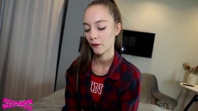 This cute little cheerleader is sucking dick and then she fucks herself in front of him to show him what he could have