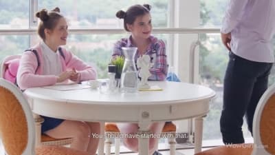 Two gorgeous brunette students, Alita Angel, and Molly Brown, suck a stiff dick at the same time and fuck their man, in this three-way video, swapping his cum.