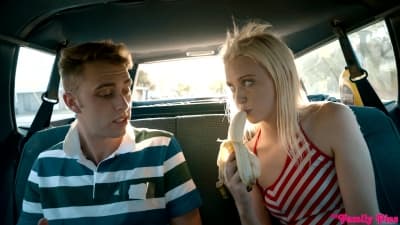 Chloe Cherry porn video where she is horny and she wants to have the dick of her brother inside of her even if their parents are driving the car.