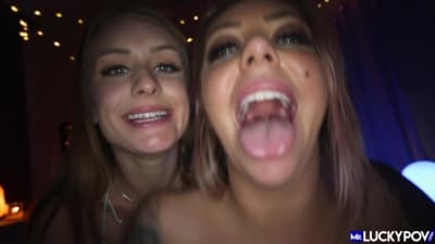 The two women, are going to take good care of the cock in POV, sucking and wanking the cock between the tits.