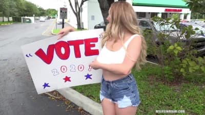 Blonde Skylar Vox, will seduce any guy with her big tits. She gets her pussy licked and they do it, doggystyle, cowgirl and missionary.