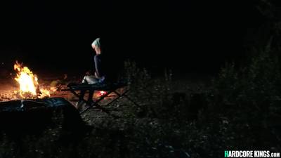 Big fake tits tattooed sexy body blonde babe Kleio Valentien and her partner Tommy Gunn fucking at night under the stars beside fire on camping