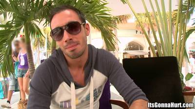 The black man puts his big hard cock in the skinny white man's mouth. It's so big! He then penetrates him hard and deep in his asshole.