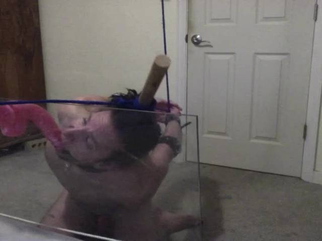 This gay man loves to be tied up and in the absence of a dominator he ties himself up and sucks a pink dildo.