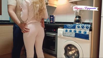 This blonde babe gives the best handjob and then he fucks her hard over the countertop before he cums on her ass