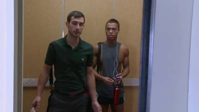 Two cute guys are trapped in the broken lift, and the sexy technician catches them fucking. They will be soon in a hot gay threesome.