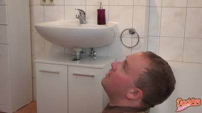 A blonde and sexy MILF urinates without any modesty in the mouth of her partner. As a reward she gives him a blowjob and gets unloaded on him!