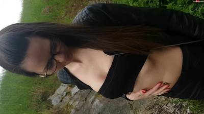 Brunette with glasses gives a blowjob outdoors