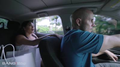 The bombshell Serena Santos, comes back from the sales and she's ultra hot! She's going to show off her tits and come and grab the driver's cock to fuck him.