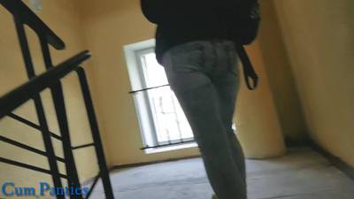 A young slut meets a guy in the staircase. He pulls out a big cock, she pulls down her panties so he can look at her pussy and cum!