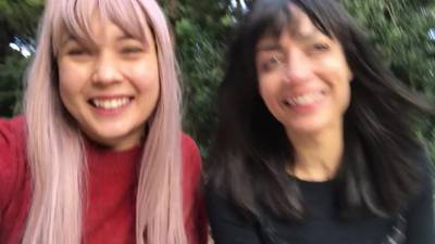 A brunette and a blonde masturbate outside