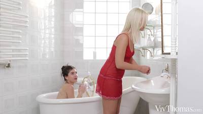 The blonde will join the brunette who is taking a nice bubble bath, they will kiss and and do a cunni. Lika Star and Stefany Kyler.