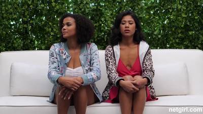 Two ebony gorgeous girls Demi and Lily share a big cock