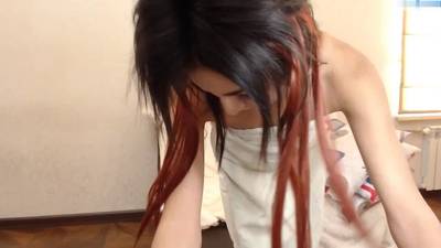 A teen Asian girl with small breasts sits on the floor and masturbates her hungry pussy with her fingers and sex toys.