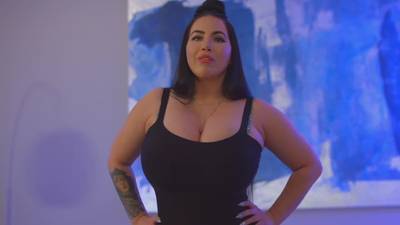 The amateur busty babe, slowly licks the tip of her dildo and then begans to suck it, before she shoves it inside her pussy.