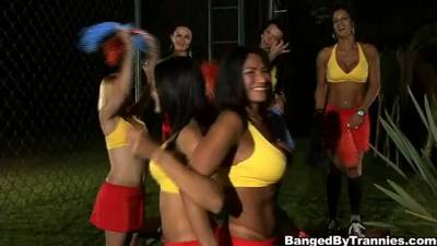 Babes are practicing their moves and cheers as they show their bodies to their trainer. Then, one by one will have a chance to fuck him
