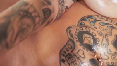Fondling, pussy penetration, tattoos, big natural tits and lust, that's what you'll see in the lesbian scene between a blonde and a redhead.