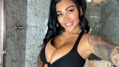 Beautiful Latina, amateur brunette with big tits and big ass has a body covered with beautiful tattoos and is eager to show off this masturbation.