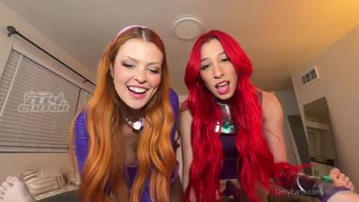 Two girls with red hair and big tits, appear in a POV amateur scene as they suck a big dick and receive a facial!