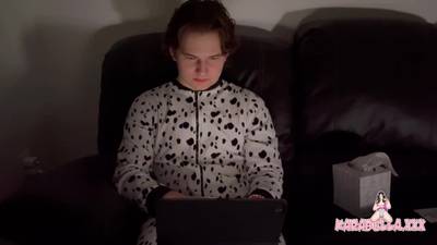Home alone and jerking off to his lovely transgirl, he fell asleep and his fantasy babe knocks his door, rock hard and ready to fuck him
