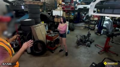 Nina Lopez, a filthy and busty slut, gets fucked in a dirty garage shop, as a thick cock pounds her tight pussy, her big tits bouncing with each thrust